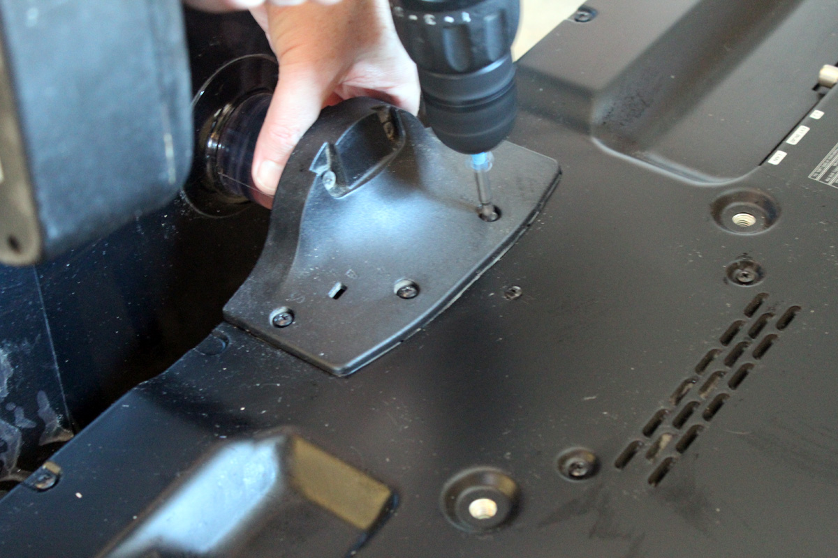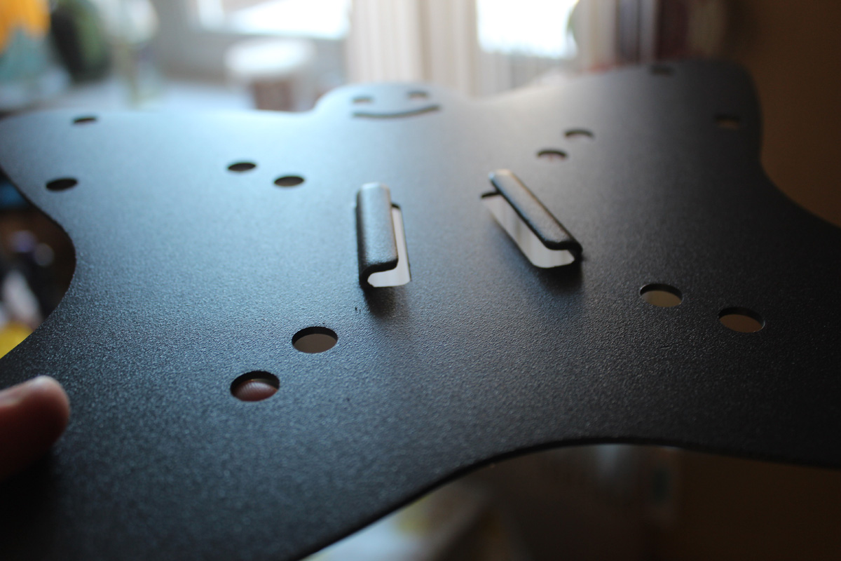 Завершающий этап — крепим ответную часть кронштейна на заднюю стенку телевизора с помощью болтов, идущих в комплекте с кронштейном. Но сначала следует снять ножку телевизора.