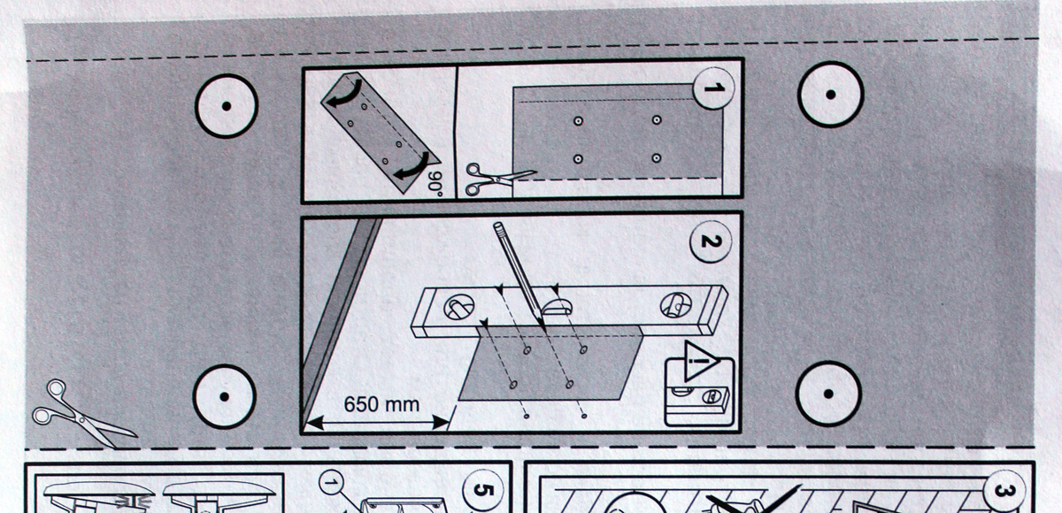 Заметим также, что в комплекте вместе со схемой монтажа прилагался бумажный шаблон с отверстиями, который нужно согнуть и приложить к стене. Предусмотренный шаблон позволит закрепить кронштейн идеально ровно, что было бы затруднительно в противном случае, ведь у кронштейна нет достаточно длинной горизонтальной стороны, на которую бы можно было ориентироваться.