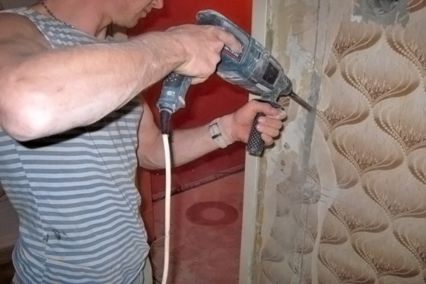 - Вдоль всей длины штробы делаются отверстия необходимой глубины на расстоянии 10-15 см друг от друга.