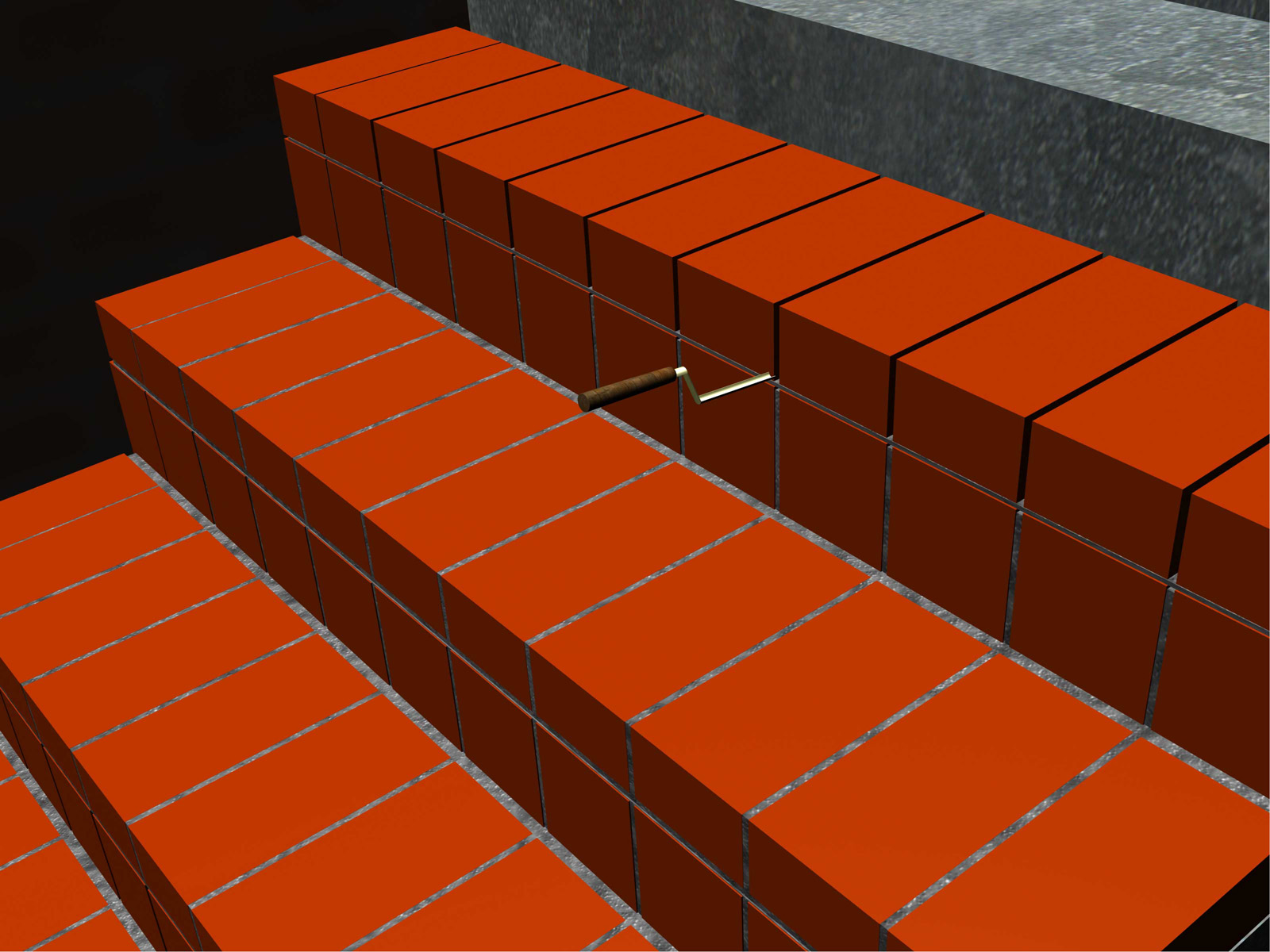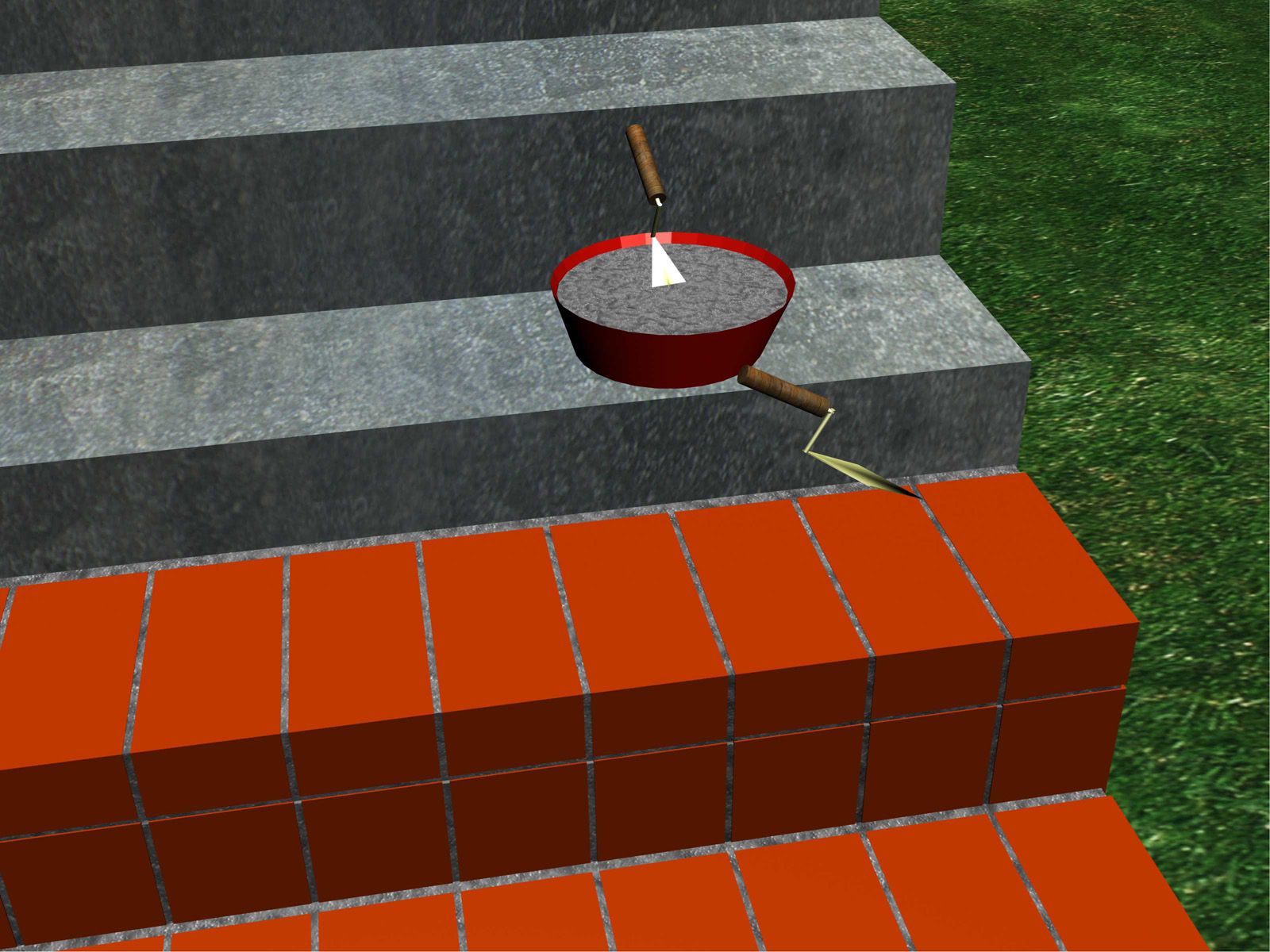 7. Наведите цементный строительный раствор и выложите его ровным толстым слоем (примерно 1,25 см) на ступеньку, на которую будете укладывать кирпичи. Начинать укладку кирпичной лестницы рекомендуем с самой верхней ступеньки, чтобы не испортить кладку кирпичей пока раствор еще не затвердел.
