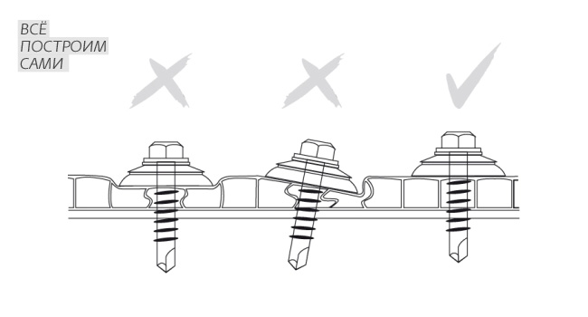 — Для соединения листов с получившейся конструкцией понадобятся саморезы со специальными уплотнительными шайбами. Не стоит пытаться врезать или вбить крепежи привычным способом.