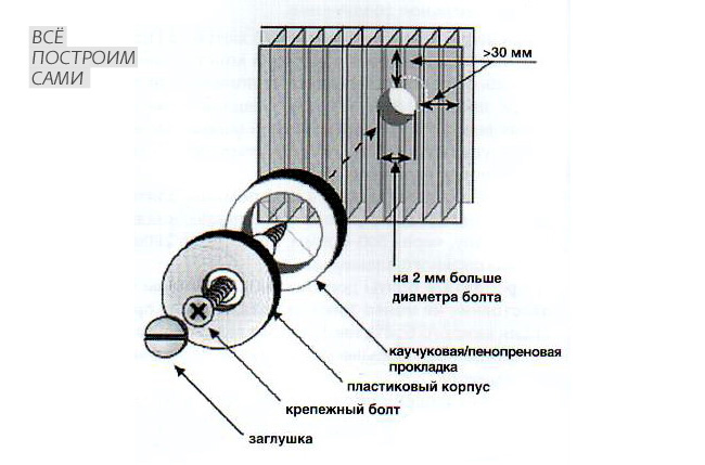 Для того чтобы поликарбонат не деформировался, понадобится отметить места для саморезов по разметке, после чего просверлить в них отверстия. Диаметр таких отверстий должен превышать диаметр саморезов. Для итогового закрепления нам и понадобятся уплотнительные шайбы.
