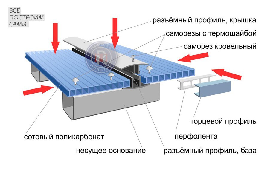 Заворачивая саморезы, не перестарайтесь. В случае температурного перепада сегменты крыши должны иметь возможность смещаться, иначе сооружение в скором времени придет в негодность.