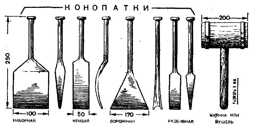 Для заделки швов используют «наборную» конопатку. Она являет собой плоское зубило, размер лезвия которого 0,6×10 см.