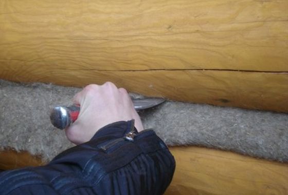 При первом конопачении льноватин и джут закрепляют строительным степлером. Необходимо, чтоб утеплительный материал выступал за пределы пазов где-то на 5 см с обеих сторон сруба.