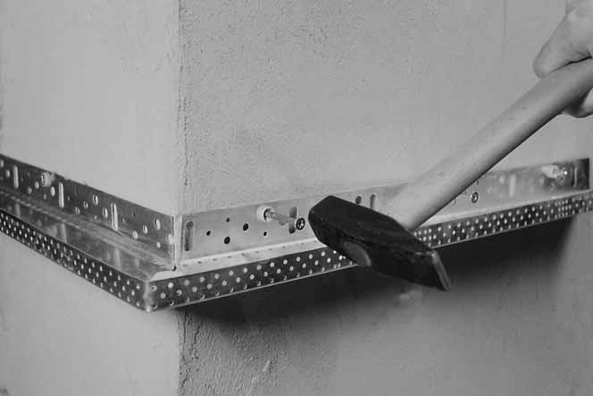 Первым делом проводим все грязные работы, в которые входят установка маяков и цокольного профиля.