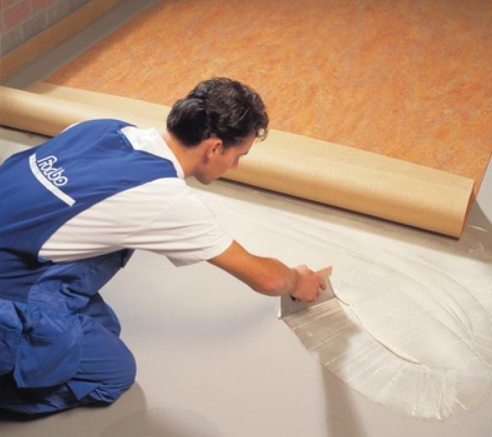 - Неправильная укладка. Линолеум, особенно если его принесли из условий с пониженным температурным режимом, перед настилом должен некоторое время облежаться в свернутом виде. Если не учесть этого условия, могут появиться изломы. Поверхность пола должна быть идеально ровной и чистой. Для приклеивания линолеума используется специальный выравнивающий раствор, если основой служит бетонная стяжка.