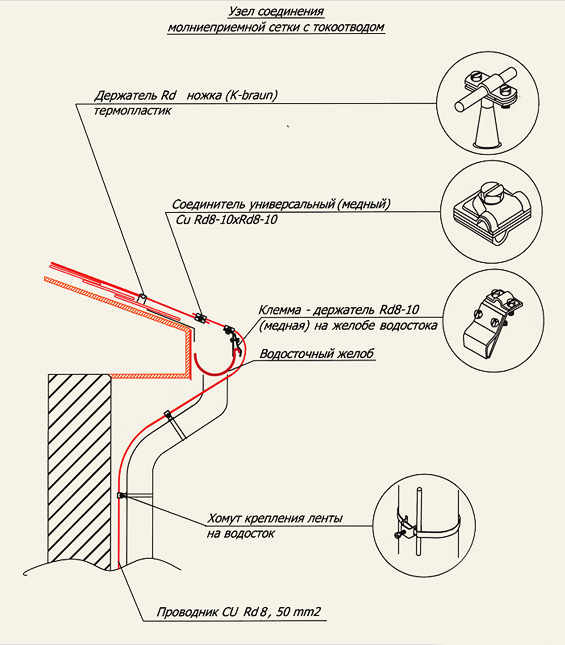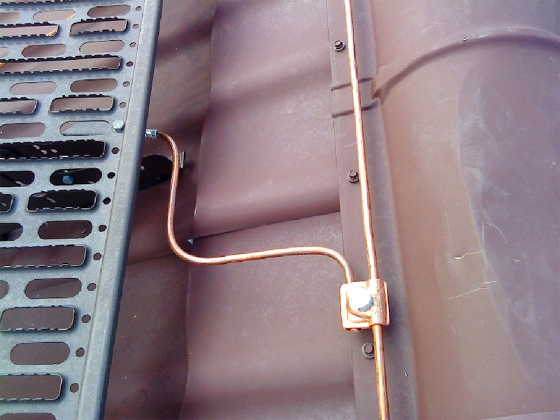 Одна из ключевых частей молниеотвода, токоприемник чаще всего представляет собой достаточно толстый провод из меди или алюминия, который прикрепляется специальными муфтами к молниеприемнику и заземлителю. Для того чтобы провести его по стене дома, используются пластиковые крепежи. Также токоотвод должен быть изолирован от воздействия окружающей среды, что часто делается с помощью обыкновенного канала для кабелей.