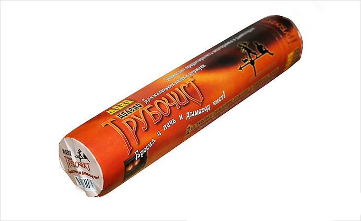 3. Полено-трубочист — одно из наиболее популярных средств, используемых в целях чистки дымохода от сажи. Оно содержит уголь, воск, опилки и другие активные вещества, способствующие эффективному очищению труб печей и каминов. Частота использования полена не превышает двух раз за весь отопительный сезон. Когда вы начинаете испытывать дискомфорт от пребывания в комнате с функционирующим камином, необходимо сжечь одну упаковку вместе в топливом. Особенно хорошо «Полено-трубочист» очищает трубы с кирпичными стенками.