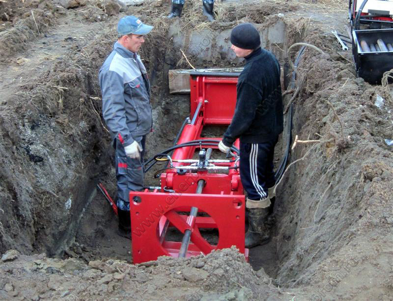 - Краном или вручную опускаем установку для прокола и монтируем её, на дне траншеи. Формирование на задней от прокола стороне, опорной стенки, не требуется ни для отечественной ни для импортной установки. Уточняем направление, глубину прокола, угол наклона прокола.