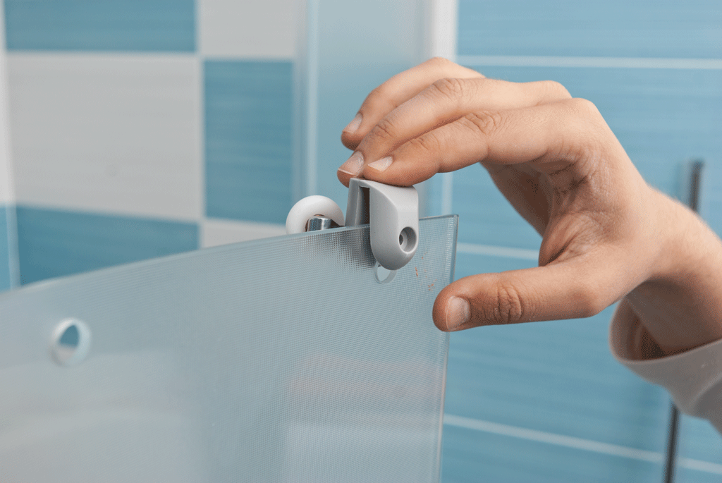 На картинке, приведенной ниже, показана установленная в ролики дверь душевой кабины. Если ролики не установить должным образом, то и дверь не будет открываться как нужно.