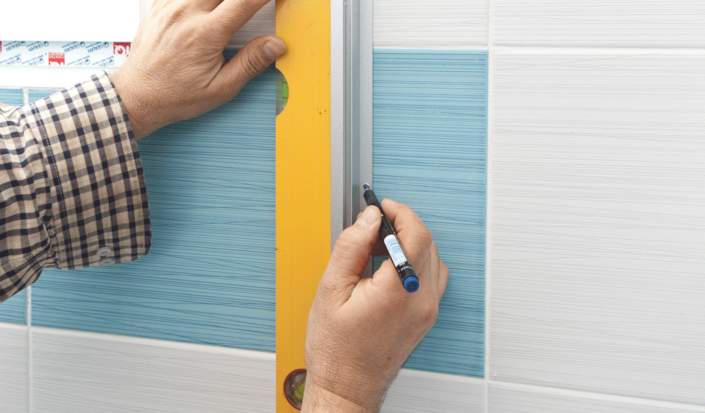 После этого с помощью уровня или отвеса необходимо нанести на стену направляющие вертикальные линии, а затем отметить места, в которые планируете вкручивать винты. Эти действия необходимо повторить на обеих сторонах душа.