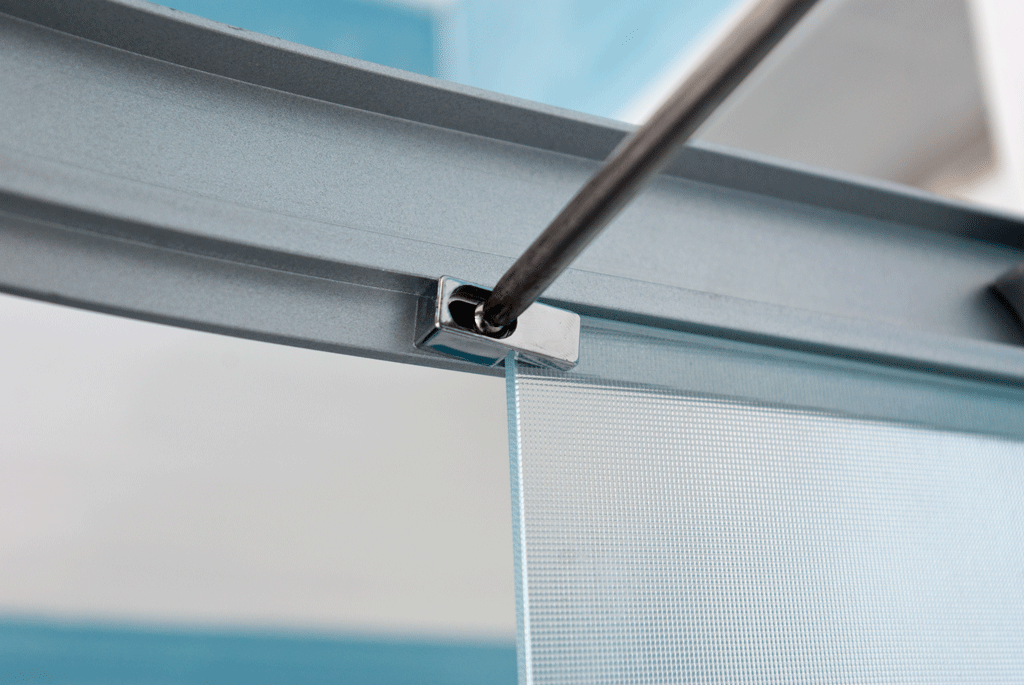 Установите дверь в каналы и проверьте, что она скользит должным образом. В случае необходимости отрегулируйте валики, но надавливайте слишком сильно. Часто бывает, когда небрежность при установке приводит к сколам дверей или вовсе дверь разбивается при падении, поэтому будьте предельно аккуратны и внимательны.