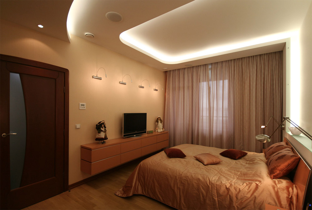 Имели ли вы раньше дело с конструированием потолочных ниш? Если да, то должны быть в курсе, что при монтировании подвесного потолка и подсветки «съедается» какое-то расстояние. В результате потолок будет выглядеть ниже. Рекомендуется заниматься таким мероприятием в помещении, где высота стен достаточно велика. В таких условиях вас и ваше воображение ничто не станет стеснять.