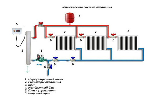 Ключевой принцип системы – принудительная циркуляция воды или другого теплоносителя. Такое устройство способно достаточно быстро нагреть отопительные приборы в доме и повысить температуру воздуха.
