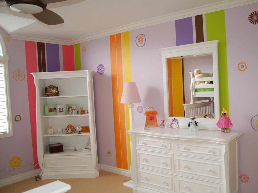 Полоски не обязательно должны быть однотонными. Обоями с яркими полосками можно оклеить игровую зону, а остальные стены – приглушенными оттенками. Эффектно выглядит комбинирование нескольких оттенков на одной стене.
