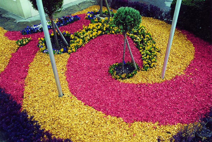 Хорошо подходит для благоустройства общественных и частных территорий. В парковых зонах, скверах, на газонах или около частных домов цветочная клумба, украшенная декоративной измельченной древесиной, приобретает особую выразительность и завершенность благодаря контрасту между цветущими насаждениями и оттенком древесной основы.