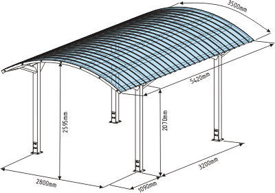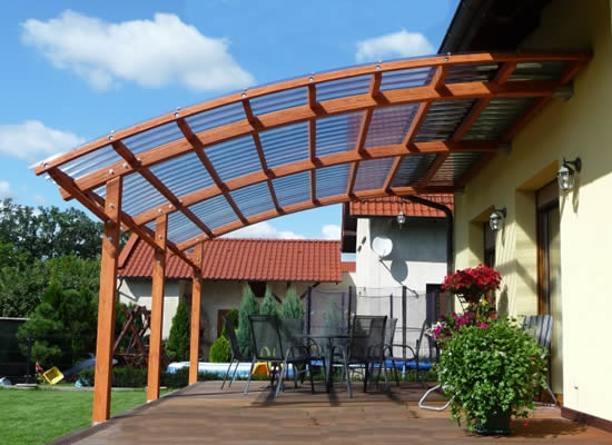 7. Теперь следует сделать крышу навеса. При сборке каркаса крыши руководствуйтесь подготовленным ранее чертежом. Чтобы сделать легкий козырек для покрытия используется поликарбонат, который крепится на легкий и гибкий перфорированный профиль из алюминия, это к тому же позволяет придать кровле арочную форму. Для более тяжелых кровельных материалов применяются металлические или деревянные обрешетки.