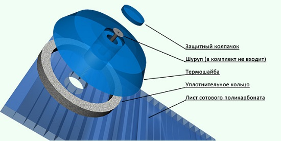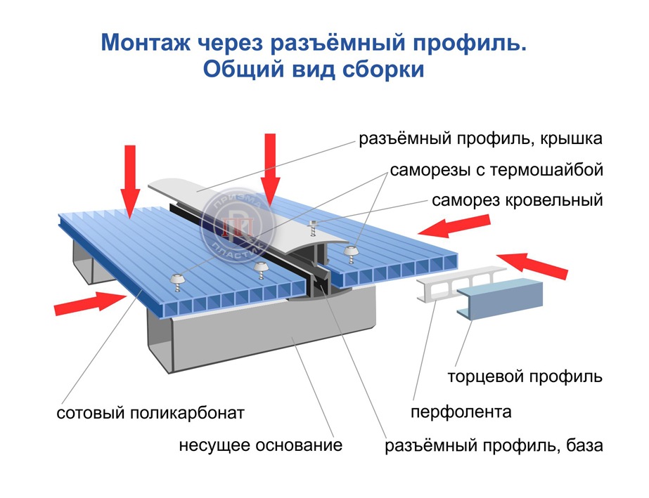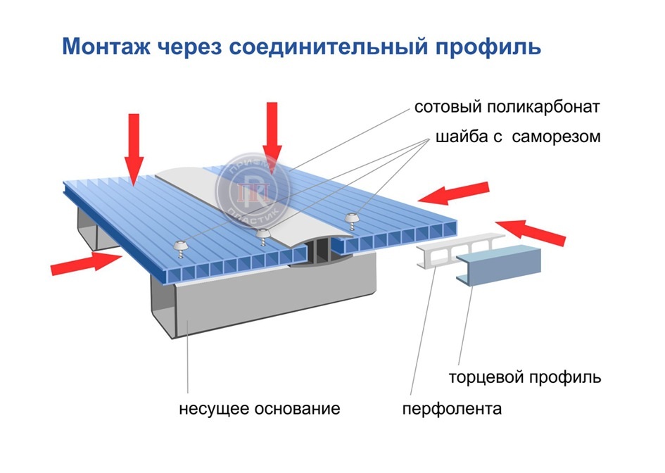 9. После установки каркаса, начинайте кровельные работы. Поликарбонат крепится к профилю с помощью пресс – шайб, профилированные листы – также, но с небольшим нахлестом в 4-5 сантиметров.