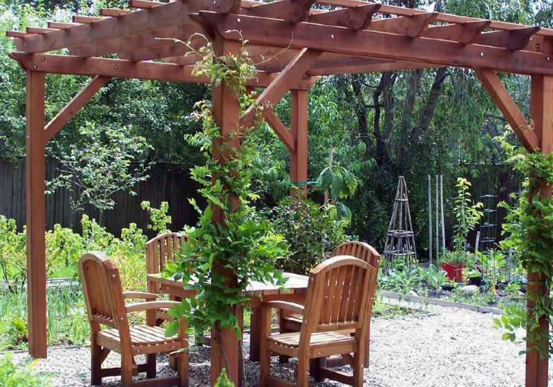 11. Когда основная конструкция практически завершена, можно позаботиться о ее украшении. Можно соорудить опоры для вьющихся растений в виде декоративных флористических лесенок или натянув между основанием и крышей прочные нити. Можно украсить навес, соорудив ширмы в виде плетня или решетчатые стенки, эстетический аспект постройки зависит только от вашей фантазии и дизайнерских способностей.