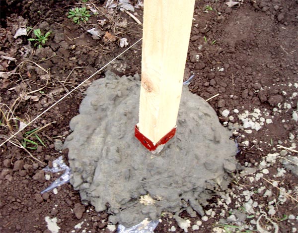 - Установить в ямки столбы. Имейте в виду, что расстояние между ними не должно превышать 3 метров. Для укрепления столбов существует несколько способов, наиболее часто используется тот, при котором ямка с основанием столба заливается смесью цемента, щебня и песка. Данная смесь тщательно утрамбовывается несколько раз. В некоторых случаях к нижней стороне столба забора приваривается широкая пластина для того, чтобы его было невозможно выдернуть из почвы. Разумеется, выбор формы столба зависит только от вас, но желательно делать их скошенными – в этом случае вода будет скатываться по поверхности, не нанося древесине ущерба.