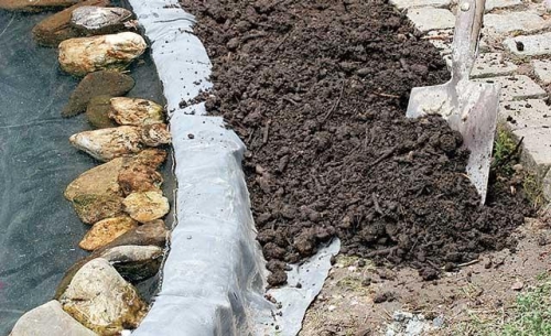 - Укладываем геотекстиль. Для предотвращения разрывов материал укладываем свободно. Верхнюю часть, с хорошим запасом, лежит на контуре, образованном шлангом.