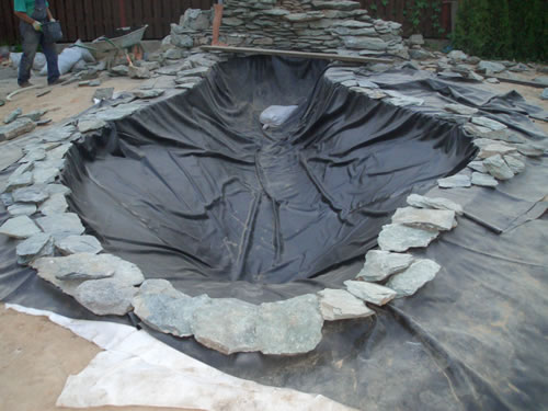 - Укладываем гидроизоляционную пленку. Размеры ее подбираем соответственно с полуметровым запасом по краям. Полиэтиленовая пленка не менее 500 микрон укладывается в два слоя, соединяется и герметизируется специальным прибором. Но проще использовать каучуковую пленку, которую можно склеивать и она отличается длительным сроком эксплуатации. Пленку также размещаем свободно но ложу будущего водоема.