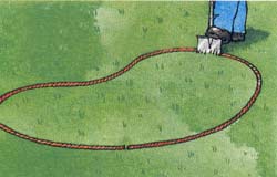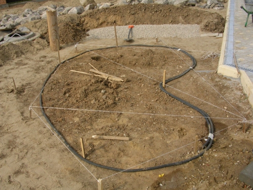 - Очерчиваем контуры водоема. Делаем это строительным шнуром, уложенным на грунт по форме задуманной вами береговой линии. Вместо шнура можно использовать сухой песок.