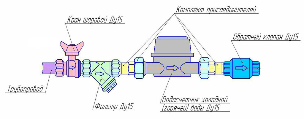 Потом вставляете прокладки (они в комплекте со штуцерами), монтируете счётчик. У вас, в конечном итоге, должна получиться такая установка счётчиков воды своими руками: первый элемент от врезки — кран, за ним должен быть правильно установленный фильтр, затем — очередь счётчика, и последним будет обратный клапан. После проверки того, правильно ли вы установили конструкцию, можно вкрутить переходную муфту в тот же обратный клапан, соединить её с водопроводом.