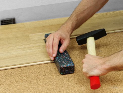 - Укладываем финишное покрытие. При этом покрытие свободно лежит на идеально ровной основе, необходимо соблюсти зазоры между полом.