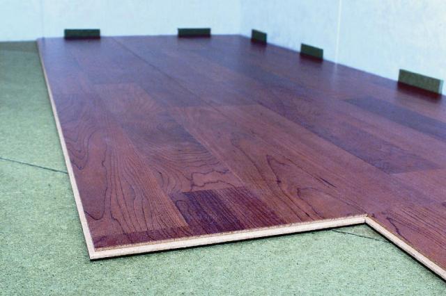 4. На фанеру или доски укладываем тонкое полиуретановое изоляционное покрытие 2-4 мм. Далее укладываем финишное покрытие из ламинатной или половой доски. Ламели скреплены между собой и никак не крепятся к полу. От стены до кромки пола 10-15 мм.