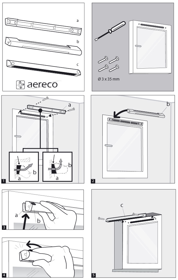 Клапан Аэрэко установить довольно просто. Монтаж по времени занимает 45-60 минут. Монтируется приточный заслон в створку окна над стеклом или в стену, а снаружи ставится козырек с контролем потока воздуха с решеткой, защищающей от пыли и насекомых.